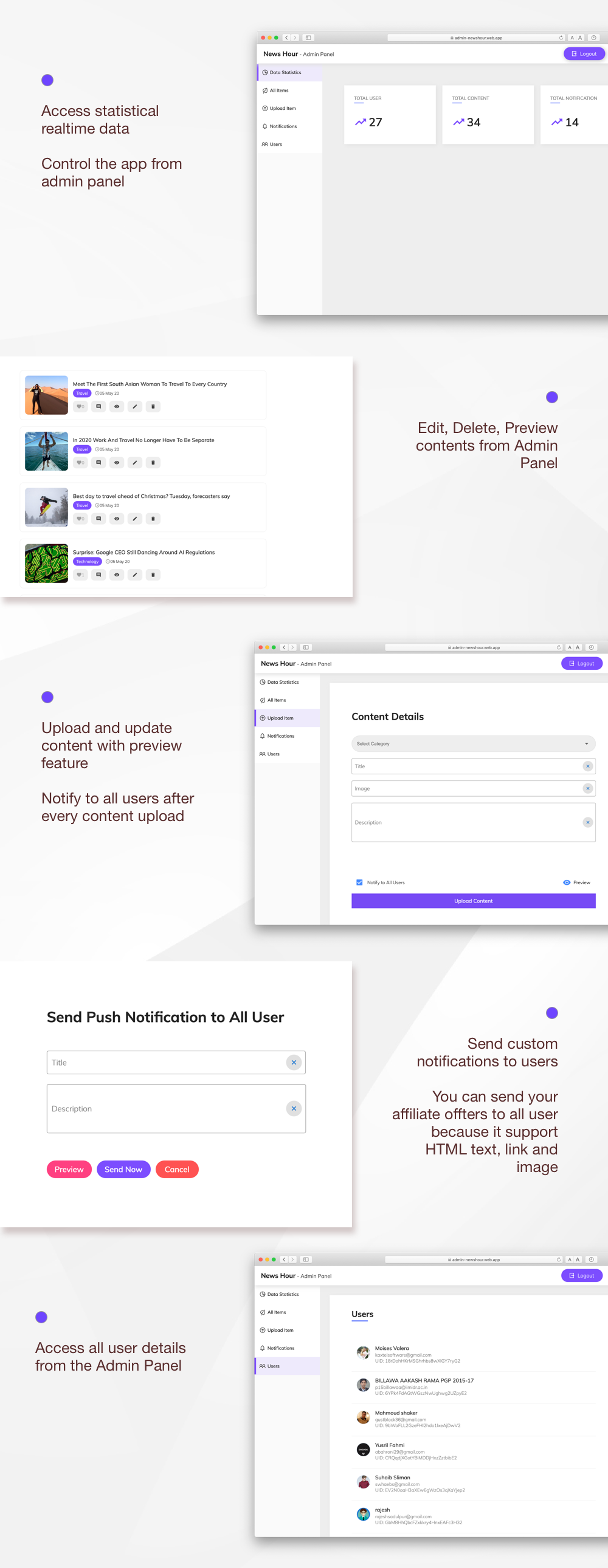 - Access Statistical data and control the app from admin panel
