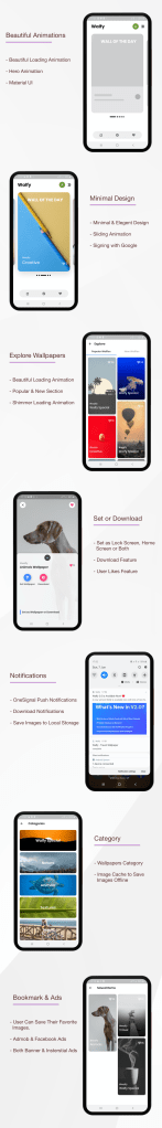 Walfy is a complete Wallpaper app with admin panel which is developed on Flutter framework developed by Google. We have used lots of animations to make this app user friendly. It could be able to satisfy users with impressive UX design and smooth performance. We have focused on 3 things – Completely Unique Design, Animations & Revenue from Advertisements. That’s why we added both admob and facebook ads. As apple doesn’t accept any third party wallpaper app, this app is only for android devices.